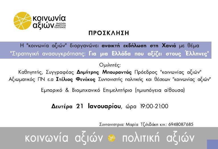 Η ‘’κοινωνία αξιών’’ διοργανώνει ανοικτή εκδήλωση στα Xανιά, με σκοπό τη γνωριμία με τους πολίτες του νομού, την ενημέρωσή τους σχετικά με τη στρατηγική του κόμματος για την ανασυγκρότηση της χώρας, καθώς και την ανταλλαγή απόψεων.