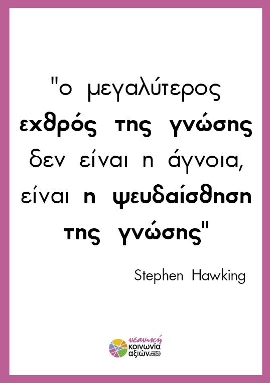 Posted by Aristotelis Tsagkarogiannis on March 24, 2013 in Έμπνευση, νεανική κοινωνία αξιών and tagged αξιων, αξιών, εχθρός της γνώσης, εχθρος της γνωσης, κοινωνία, κοινωνια, νεανική, νεανική κοινωνία αξιών, νεανικη, νεανικη κοινωνια αξιων, Stephen Hawking.