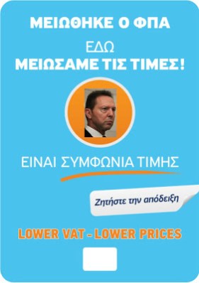 Την Τρίτη θα μοιραστούν στους επιχειρηματίες τα πρώτα 10.000 σήματα με λογότυπο τη φάτσα του Στουρνάρα που θα ειδοποιούν τους καταναλωτές για τις μειώσεις στις τιμές, αλλά το πιο πιθανό είναι ότι θα τους κόβεται η όρεξη δια παντός, ενώ υπάρχει η σκέψη να μαρκάρονται με τατουάζ οι πελάτες που έφαγαν με μειωμένο ΦΠΑ για ακόμα μεγαλύτερη διαφήμιση του μέτρου.