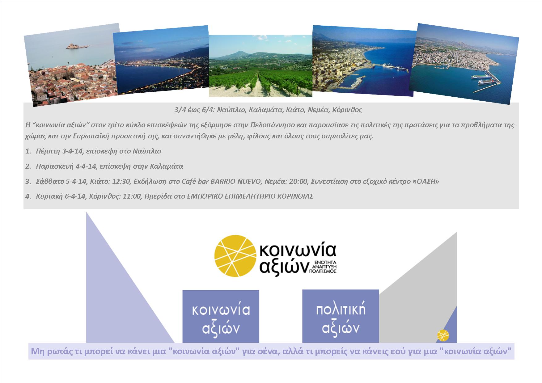 Πολυπληθής αντιπροσωπεία της “κοινωνίας αξιών” επισκέφθηκε το Ναύπλιο, την Καλαμάτα, το Κιάτο, τη Νεμέα και την Κόρινθο, όπου έγιναν συναντήσεις με συμπολίτες, μέλη και φίλους της “κοινωνίας αξιών”, και δόθηκαν συνεντεύξεις τύπου σε τοπικά ΜΜΕ (τηλεοράσεις, ραδιόφωνα και έντυπα μέσα).